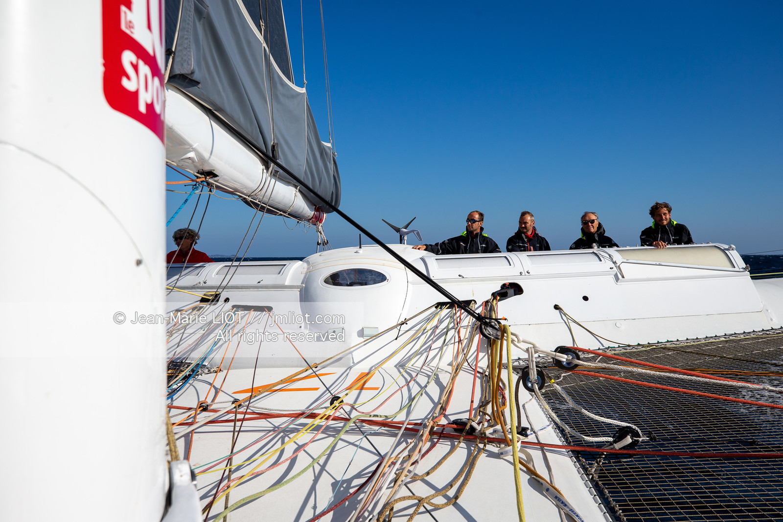 Description | Francis Joyon et son équipage à bord de l’Ultim IDEC Sport avant le départ de l'Asian Tour 2019-2020, le 18 septembre 2019, Photo © Jean-Marie LIOT / AleA. |