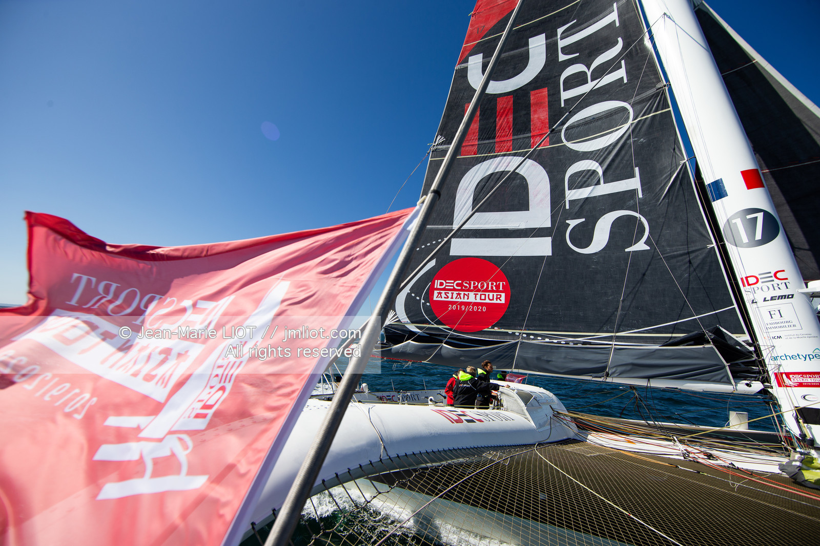 Description | Francis Joyon et son équipage à bord de l’Ultim IDEC Sport avant le départ de l'Asian Tour 2019-2020, le 18 septembre 2019, Photo © Jean-Marie LIOT / AleA. |