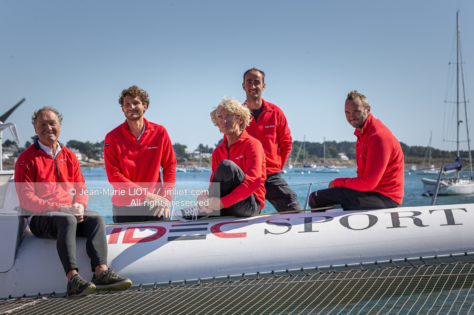 Description | Francis Joyon et son équipage à bord de l’Ultim IDEC Sport avant le départ de l'Asian Tour 2019-2020, le 18 septembre 2019, Photo © Jean-Marie LIOT / AleA. |