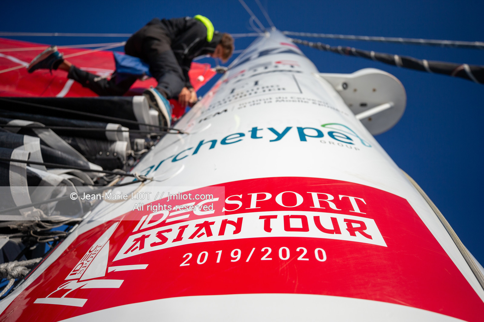 Description | Francis Joyon et son équipage à bord de l’Ultim IDEC Sport avant le départ de l'Asian Tour 2019-2020, le 18 septembre 2019, Photo © Jean-Marie LIOT / AleA. |