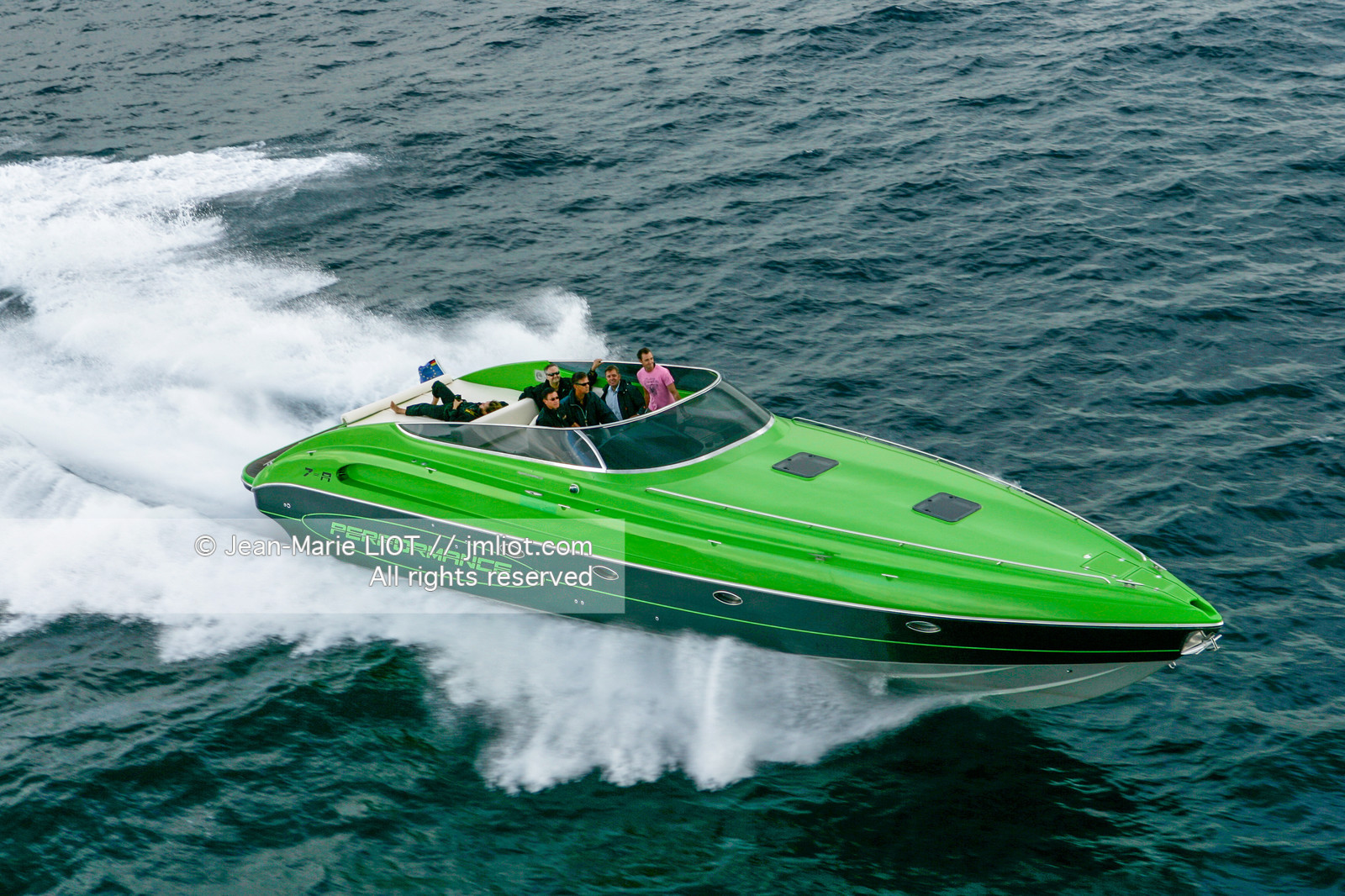 En baie de Cannes, pendant le salon nautique, vue aérienne du offshore Performance 7A. Photo © Jean-Marie Liot.