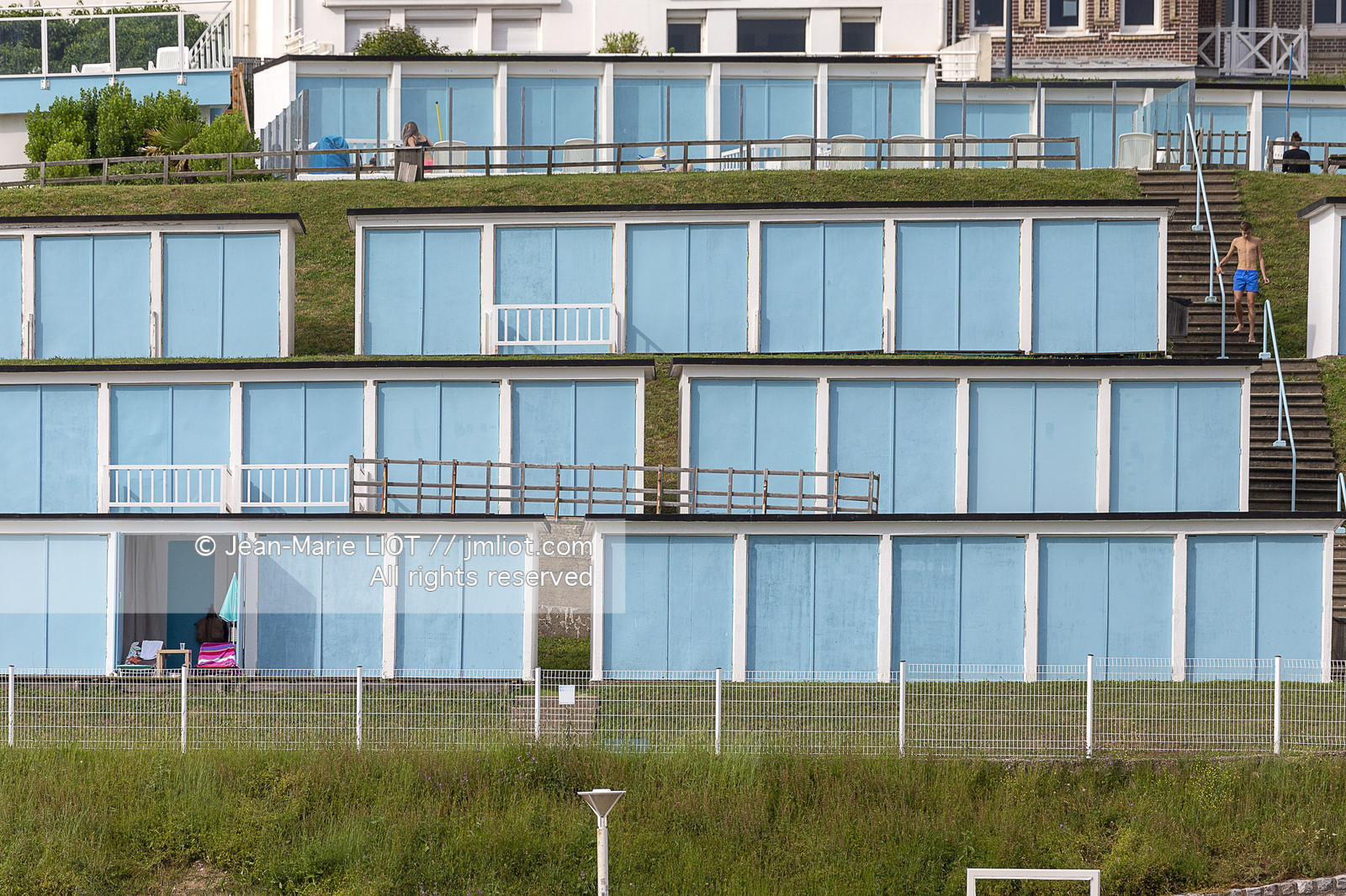 A Sainte-Adresse station balnéaire au nord du Havre, les cabines de plages aux portes bleues, accrochées à la colline. Photo © Jean-marie Liot.