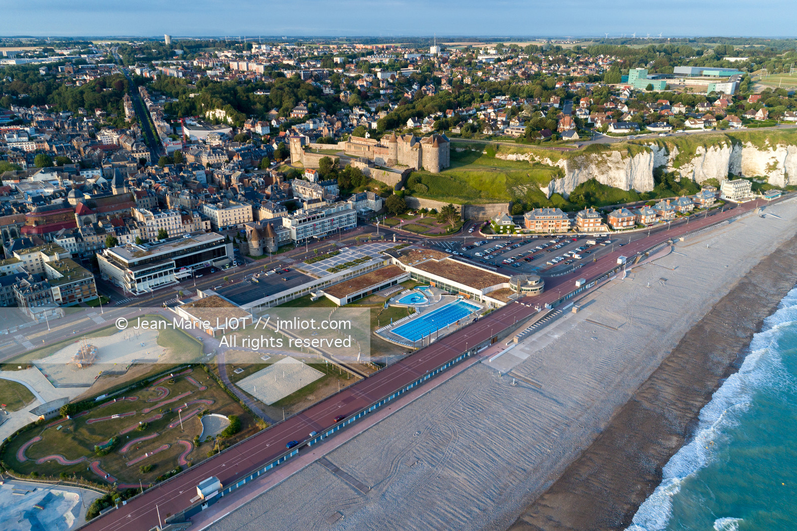 .France, Normandy, Seine Maritime, aerial view of the city, cliffs and beach of Dieppe